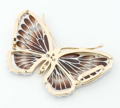 エマイユ技法を用いて独特の世界観を魅せる中嶋邦夫のニックスファクトリー。高度な技術がうかがる蝶モチーフのペンダントトップ兼帯留めです。縦長のルビーの瞳、体にはラウンドの中に1石だけペアブリリアントカットのダイヤモンドがきらりと光るデザイン。大きな羽の翅脈(しみゃく)の細やかなつくりと、エナメルの色合いは鱗粉(りんぷん)を纏った様を感じさせる見事な表現力。絵画を想わせる繊細な色遣いにため息が漏れます。大きく広げたゴールドの触覚に、輪郭に煌めくダイヤモンドが華やかさをプラス。末永く楽しんでいたける、エレガントで芸術的なジュエリーです。
