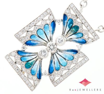 エマイユ技法を用いて独特の世界観を魅せる中嶋邦夫 ニックスファクトリーのペンダント ネックレス。エレガントで上品なデザインと、ブルーのエナメルの繊細なグラデーションがマッチしています。中央の3石のダイヤモンドは計0.51ctと存在感があり、装飾部分にあしらわれたメレダイヤモンドが華やかさを演出。トップは取り外して、ブローチとして使うこともできます。気品漂う、芸術的なジュエリーです。
