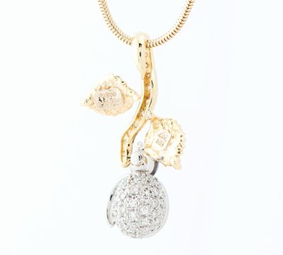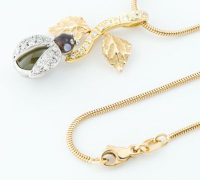 オリジナル技術「石嵌」で知られるAKコレクション。自然の中に活きる小さな逞しい命をジュエリーで表現するジュエラー 金澤郁乃のペンダント ネックレスです。頭の部分には薄茶色の石にホワイトのオパールとダイヤモンドが象嵌されています。ダイヤモンドの枝を上へ上へと登っていくような愛らしいデザインは、ゴールドの葉のマットな質感と可動して揺れるてんとう虫がポイント。胴体には、シャットヤンシー効果によってシャープな一筋の線が浮かび上がるクリソベリルキャッツアイをセット。贅沢にも、胴体の裏側にもダイヤモンドが惜しみなくパヴェセッティングされています。コレクションの中でも存在感を一際放つ、個性的なジュエリーです。