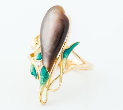 特徴 エマイユ技法を用いて独特の世界観を魅せる中嶋邦夫のニックスファクトリー。地金部分に繊細な彫金模様を施し、模様が浮き出るよう釉薬を載せて焼き付ける技法で鮮やかなグリーンの葉を表現しています。つぼみの黒百合を黒蝶貝の光沢を効果的に使し表現。動くたびに美しく艶めきます。朝露のように煌めく1石のダイヤモンド、伸びやかな美しいデザインからも瑞々しさが伝わります。初期にデザインされた作品で、素朴なモチーフを芸術的に仕上げた個性的なジュエリーです。