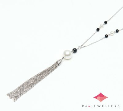 特徴 テリの良い11.4mmの白蝶真珠と、ゆらゆらと揺れるチェーンの組み合わせが目を引くタッセル ペンダント・ネックレスです。オニキスのブラックと、シャープなダイヤモンドの煌めき、柔らかな真珠の色合いがお互いを引き立てます。動きのある、ボリュームミーで華やかなジュエリーです。