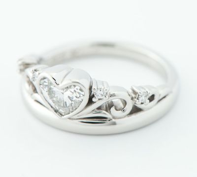 名古屋の小さなジュエリー店から、日本最大級のオーダーメイドブランドへと成長を遂げたケイウノ。プリンセスの象徴ティアラをモチーフに、0.554ctのハートブリリアントカットダイヤモンドをメインにセットした贅沢なリングです。美しい透かし模様を施し、普段使いもできるよう高さを抑えたデザインに仕上げられています。女性の心をくすぐる、ロマンティックなジュエリーです。