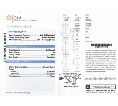 重さ:0.26ct カラー:D クラリティ:VS2 カット:EXCELLENT 研磨状態:EXCELLENT 対称性:EXCELLENT サイズ:4.14×4.16×2.51mm 蛍光性:NONE 形状:ラウンドブリリアントカット