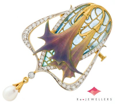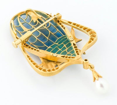 特徴 「バルセロナの至宝」と謳われるスペインのジュエリーブランド MASRIERA(マリエラ)のブローチです。マリエラ社のジュエリーは、マリエラ七宝という半透明の七宝技術を用い、ほぼすべてハンドメイドで製作されています。プリカジュールで表現したブルーの美しいグラデーションと立体的でマットな紫の花との奥行とコントラストが、作品としての存在感を与えています。優美な枠の曲線から、流れるように揺れるテリの良い淡水パール。芸術品としての一体感を感じる、絵画のように繊細なジュエリーです。
