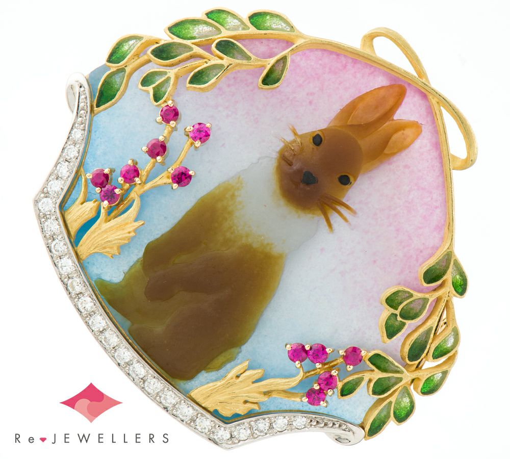 エマイユ技法を用いて独特の世界観を魅せる中嶋邦夫。見た瞬間に思わず笑みがこぼれる、愛らしいウサギをモチーフにした大振りのブローチです。こちらを見つめているつぶらな瞳や柔らかそうな首の部分の白い毛、どこか和を感じさせる背景のピンクからブルーへの淡い色合いのグラデーションなど一つ一つエマイユで丁寧に表現されています。シャープなピンクサファイアの輝きと、繊細な金細工がとても美しく印象的です。独自の感性が唯一無二のジュエリーを生み出す、芸術と呼ぶに相応しい逸品です。※中嶋 邦夫著書「In the garden」74ページに掲載有