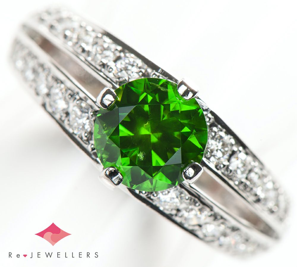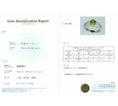 宝石名:デマントイドガーネット 重さ:1.46ct サイズ:6.7×6.7×4.4mm 形状:ラウンドブリリアントカット