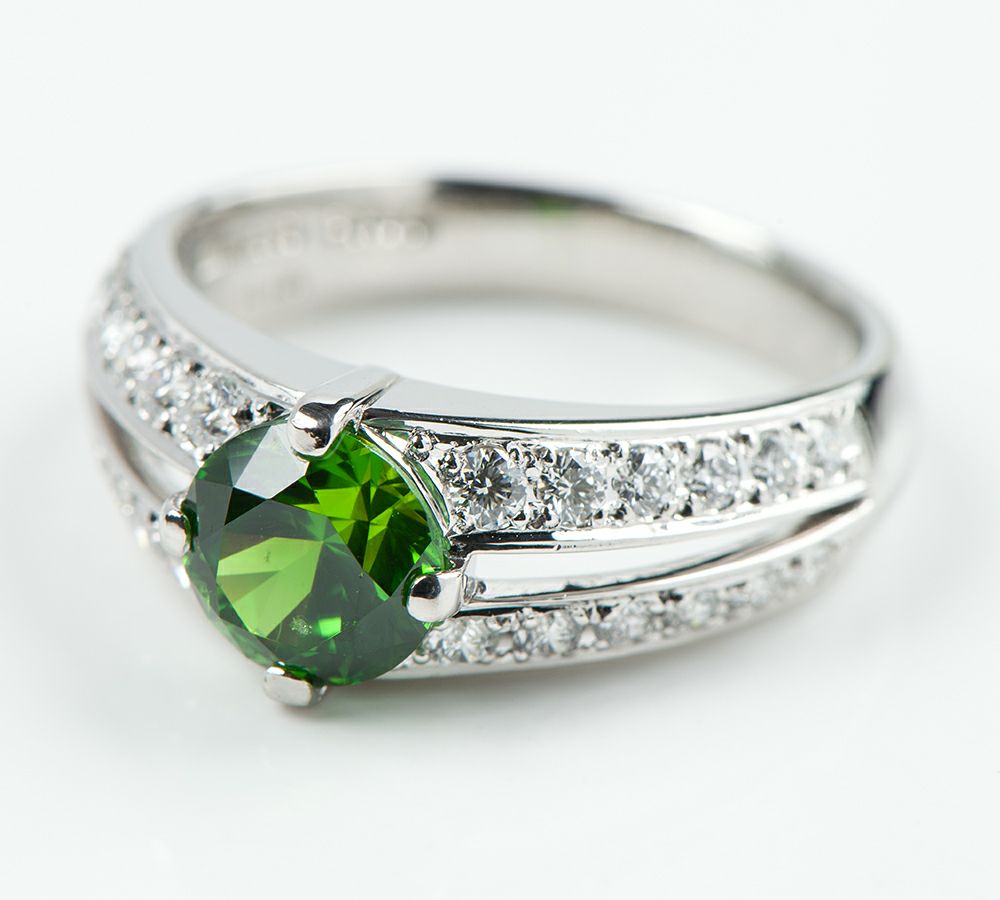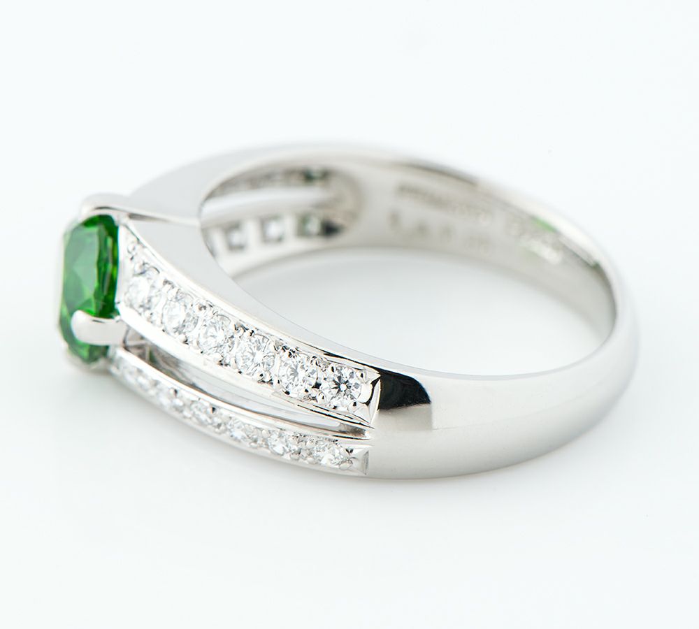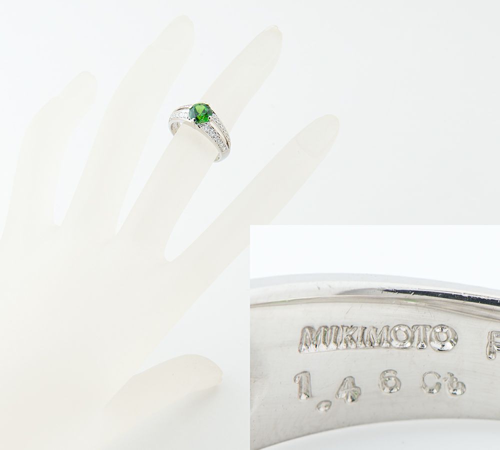ダイヤモンドにも匹敵する輝きを放つことから「デマントイド」と命名されたデマントイドガーネット。1.46ctの広い場面から放たれる眩い煌めきに引き込まれるミキモトのリングです。バランスの取れた濃いグリーンカラーと、テリの良さが魅力的。ロシアやヨーロッパでは幸運の象徴とされた、ホーステールインクルージョンを内包しています。サイドから見ても美しく洗練されたデザインに、気品が漂います。重厚感のある華やかなジュエリーです。