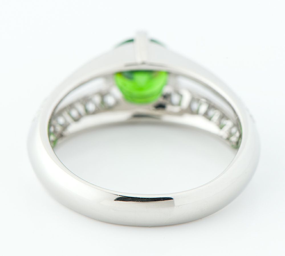品質コメント:深みのあるクリアな黄緑色。ルーペでデマントイド特有のホーステールインクルージョンや微細な内包物、および肉眼で内包物を研磨した際にできた凹みを石の表面(テーブル)に確認できますが、美しさを損なわず、透明度もテリの良さも大変優れた高品質なものがセレクトされています。