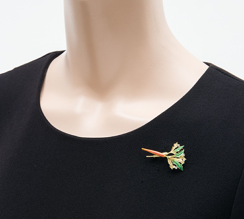 特徴 日本におけるエマイユ(七宝)ジュエリーの第一人者として高い評価を受けている、中嶋邦夫 ニックスファクトリー。人参をモチーフにバスタイユ技法を使って作られたブローチです。様々な種類の中からこの細長い形に着目した点が、自然を敬愛するニックスファクトリーらしいブランドの遊び心の表れ。生き生きと茂る葉と、煌めくダイヤモンド。美しいエマイユの赤と葉のグリーンのコントラストが美しい、繊細なジュエリーです。