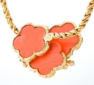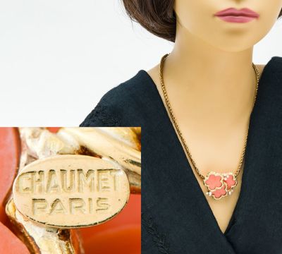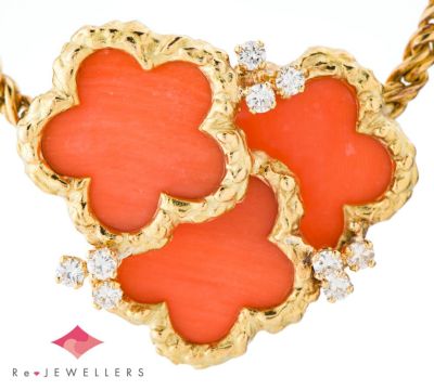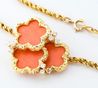 オレンジ色の珊瑚を縁どるラフなテクスチャーの金細工が美しい、ショーメのペンダント・ネックレス。愛らしい花のデザインに、珊瑚の柔らかな色合いが映えます。合間にセットされた3石のダイヤモンドが放つ眩い煌めき。トップに合わせ、チェーンはボリューミーなものがセレクトされています。一貫してアンティークのような重厚感を感じさせる、個性的なジュエリーです。