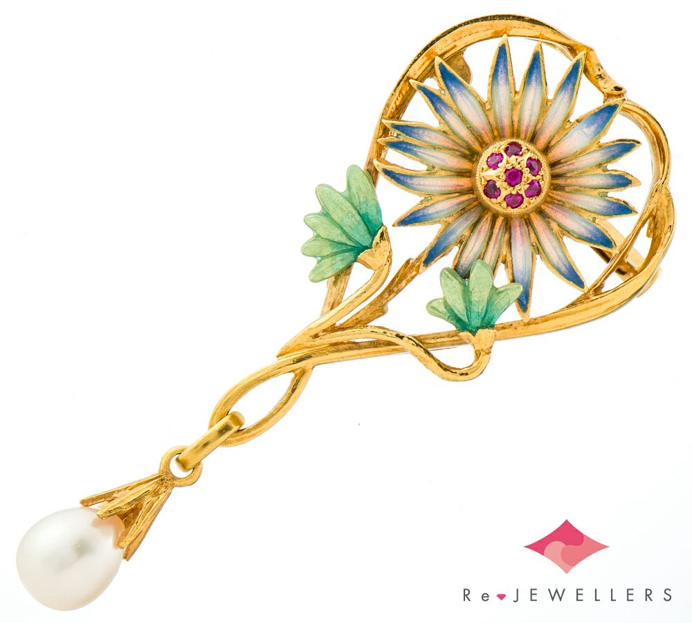 特徴 「バルセロナの至宝」と謳われるスペインのジュエリーブランド MASRIERA(マリエラ)のブローチ兼ペンダントトップです。マリエラ社のジュエリーは、マリエラ七宝という半透明の七宝技術を用い、ほぼすべてハンドメイドで製作されています。プリカジュールで表現した花びらの美しいカラーグラデーションと立体的にセットされたルビー、エナメルの艶やかなグリーンとのコントラストが、見る者を楽しませてくれる作品です。流れるようなデザインの先端には揺れるテリの良いパールがよりエレガントな印象に。芸術品として大切にしたいと思える愛らしいジュエリーです。