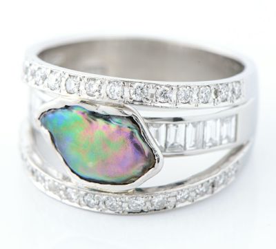イリデッセンス(虹色)の美しい希少なアワビ天然真珠をセットしたリングです。鮮やかなグリーンやピンクの色合いが目を引き、見る角度によって変わるオーロラのような輝きが特徴です。サイドに並んだステップカットダイヤモンドのシャープなデザインが、真珠の個性的な形をより際立たせています。二つと同じものが存在しない、唯一無二のジュエリーです。