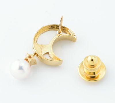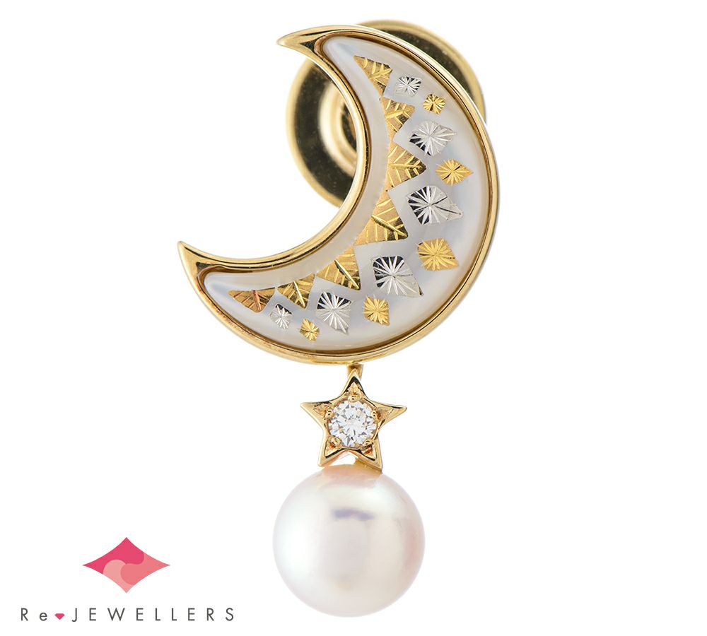 ミキモトの人気シリーズ ピクウェのブローチ。白蝶と黒蝶シェルの表面に金を象眼する技法ピクウェは19世紀に一度途絶え、現代で復元された幻の技法です。三日月と星をモチーフにした、なんともロマンティックなデザイン。柔らかなカボションカットのシェルの上に施された美しい模様に、気品が漂います。アコヤ真珠はテリの良い、ピンクの干渉所が魅力的な7.3mmの珠をセット。眩い煌めきを放つダイヤモンドと共に、ゆらゆらと優雅に揺れます。