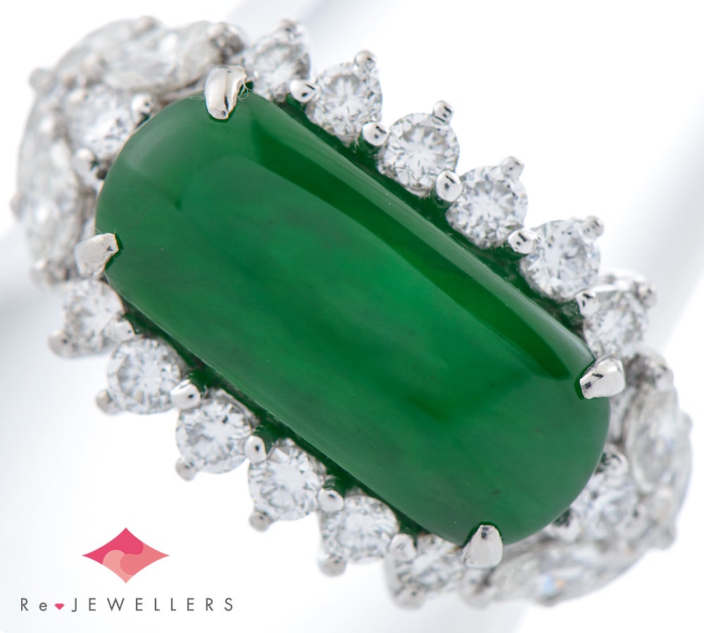 1813年に歌舞伎役者・三世中村歌右衛門が大阪に創業した、びんつけ油(商品名「芝翫香」)の店を始まりとする日本のブランド 芝翫香。しっかりとした色合いながら明るいグリーンカラーが印象的な翡翠3.78ctのリングは、透明感のある艶めきに目を奪われます。贅沢に使用した計1.23ctのダイヤモンドが華やかなボリューム感のあるエレガントなジュエリーです。