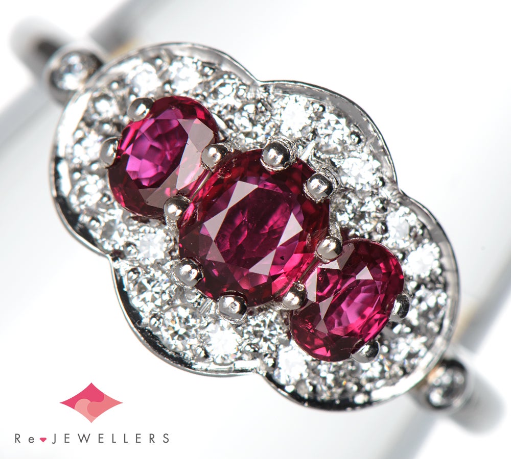 特徴 イギリスの老舗ジュエラー、ヘンネル(Hennell)のプラチナリングです。上質なダイヤモンドに囲まれ、三石並んだ濃く深いレッドのルビーに惹きつけられます。ルビーの美しさを際立たせるよう計算されたデザインは、シンプルでありながら確かな存在感。リングトップの裏側には百合の紋章(フルール・ド・リス)の透かし彫りが施され、見えない部分にもこだわりを感じます。英国ジュエラーらしい品格と個性を感じさせる、魅力的な一品です。