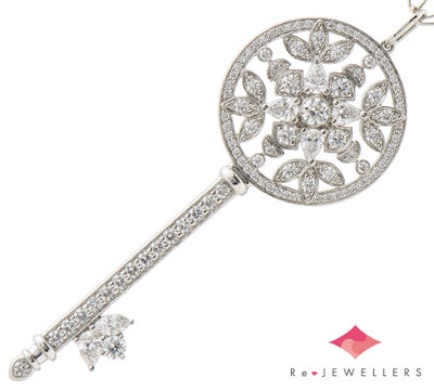 希望、前向きな生き方、そしてその先にある明るい未来をコンセプトとしたティファニーの人気シリーズ、キー。眩いほどのダイヤモンドの輝きが、確かな風格を感じさせます。選びぬかれた上質な素材と、ファンシーカットの優美な造形が組み合わさり、圧倒的な存在感を放つ逸品に。ロングネックレスのため、着脱も非常にスムーズ。ブランドの品格が宿る、ラグジュアリー感漂うハイジュエリーです。