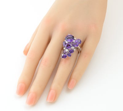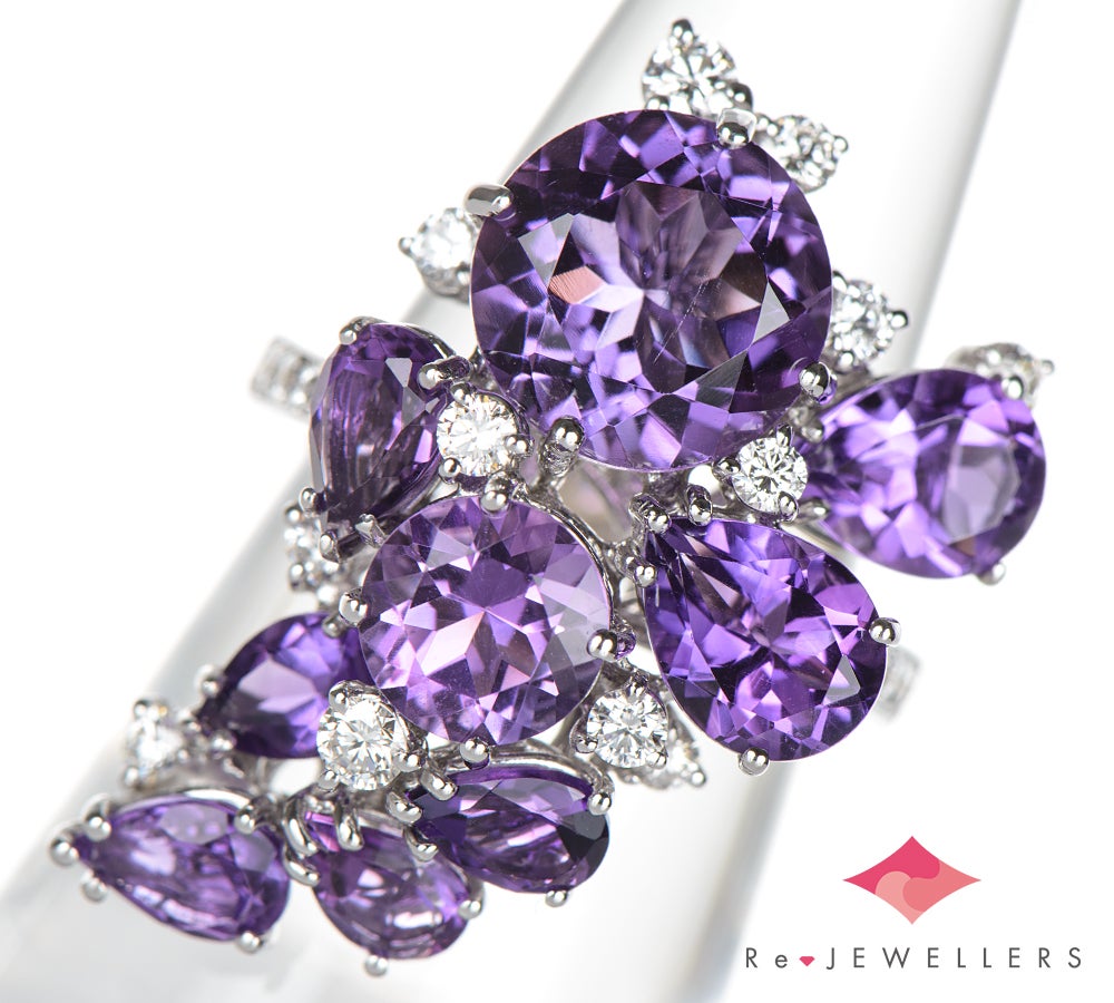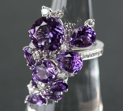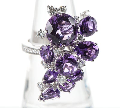 特徴 ダミアーニらしいダイナミックで立体感のあるデザインが目を引く大振りなリング。ペアシェイプとラウンドカットのアメシストを流れるように配置した、圧倒的な華やかさを誇る逸品です。力強さの中に繊細な感性が息づく完璧なバランスは、身に着けた際、装いの一部としてしなやかに溶け込みます。唯一無二の存在感を放つ個性的なジュエリーです。