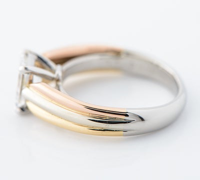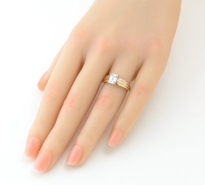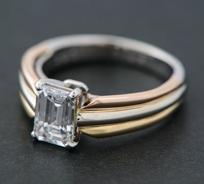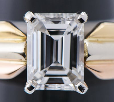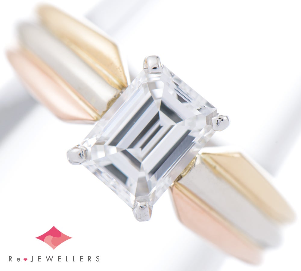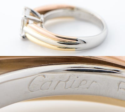 特徴 1895年以来受け継がれた定番デザインであり、不動の人気を誇るカルティエのソリテールリングです。最も特徴的なのは、アームに使用された3色。ピンクは愛を、イエローは忠誠を、ホワイトが友情を象徴。0.91ctのエメラルドカット ダイヤモンドは、石座に設けられた空間により、多くの光を取り込み美しく輝きます。圧倒的な存在感を放つメゾンを象徴するジュエリーです。