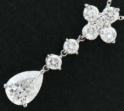 1ctアップのペアシェイプダイヤモンドをメインにセットしたペンダント・ネックレスです。メインのペアシェイプは、ふっくらとした形状で可愛らしい印象を与えます。上部にセットされたラウンドブリリアントカットのダイヤモンドがペアシェイプの輝きを引き立てています。品質の良い石を縦長にセットし、上品に仕上げられたエレガントなジュエリーです。