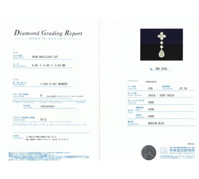 重さ:1.043ct カラー:D クラリティ:VS2 研磨状態:GOOD 対称性:GOOD サイズ:8.06×5.69×3.83mm 蛍光性:MEDIUM BLUE 形状:ペアブリリアントカット