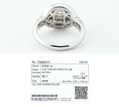 重さ:0.858ct クラリティ:SI1 研磨状態:GOOD 対称性:FAIR サイズ:7.05×5.22×3.49mm 蛍光性:VERY STRONG YELLOW 形状:オーバルブリリアントカット