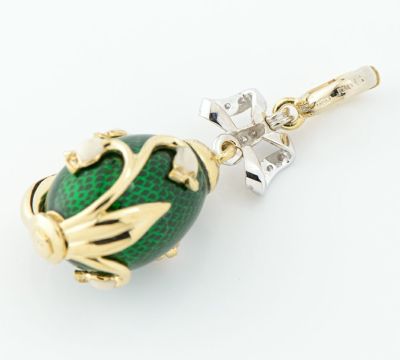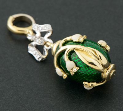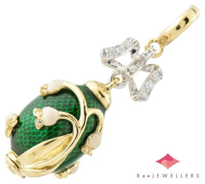 特徴 鮮やかな濃いグリーンのエナメルが美しいすずらんをモチーフにしたペンダントトップ。格子のように見えますが、やや形に丸みとムラのある有機的な模様です。イースターエッグのような卵型の曲線的なフォルムに沿い、愛らしい花々が優雅に咲きます。リボンのようにしなやかなダイヤモンドの装飾がデザインのポイントに。ほどよい甘さが魅力的なオリジナリティ溢れるジュエリーです。