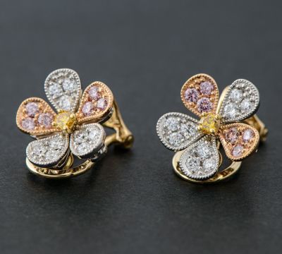 ナチュラルカラーダイヤモンドを使った贅沢なイヤリング。可愛らしい小花のデザインは、花弁に稀少なピンクダイヤモンドをセット。中央には濃くビビッドなイエローカラーダイヤモンドをあしらい、石の色に合わせ、プラチナ、イエロー、ピンクゴールドの留め爪を使用しています。ミル打ち風の装飾で、上品な仕上がりに。普段使いもしやすい、程よいサイズも魅力的な美しいジュエリーです。