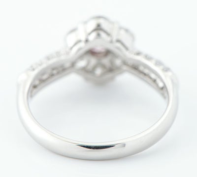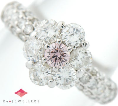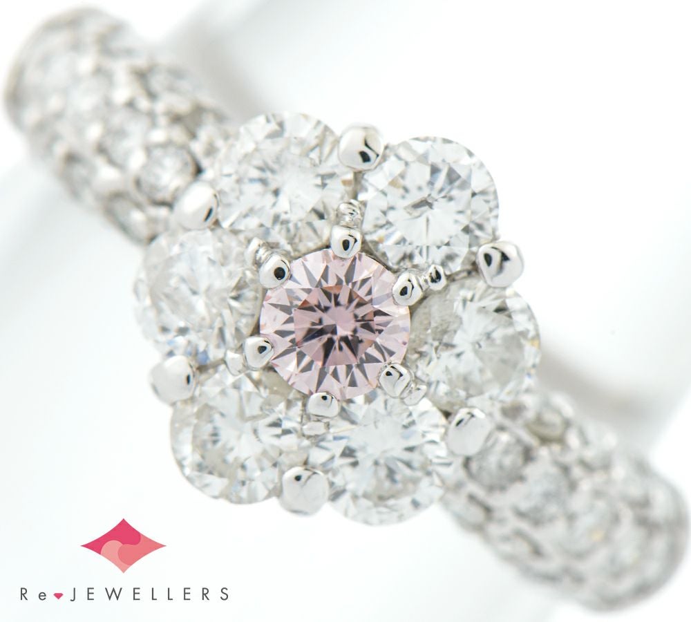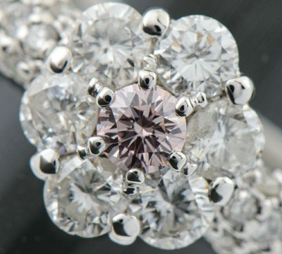 稀少なピンクダイヤモンドをセットした程よいボリューム感のあるリング。カラーはFANCY PINKと純粋な色合いで、クラリティはSI1ですがあまり内包物は目立たず、澄んだ煌めきが印象的な0.153ctのものがセットされています。花のような取り巻きのメレダイヤモンドは、大きめのものを使用することで華やかさをプラス。人気のピンクダイヤモンドを気軽に楽しむことの出きる、贅沢なジュエリーです。