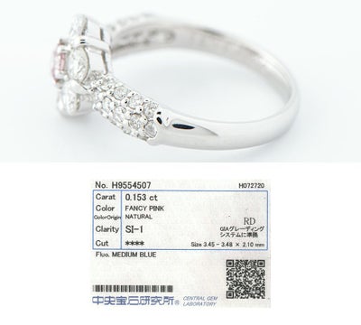 重さ:0.153ct カラー:FANCY PINK クラリティ:SI1 研磨状態:GOOD 対称性:FAIR サイズ:3.45×3.48×2.10mm 蛍光性:MEDIUM BLUE 形状:ラウンドブリリアントカット