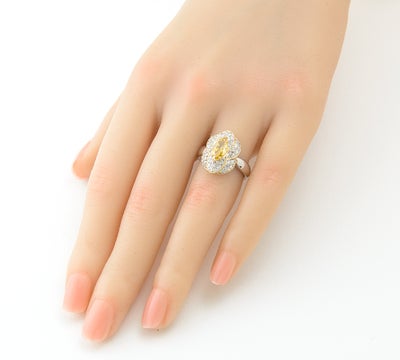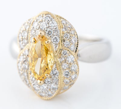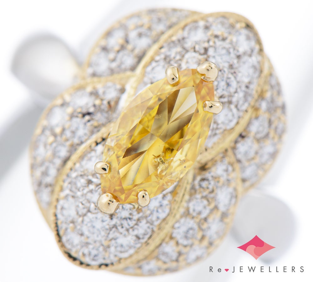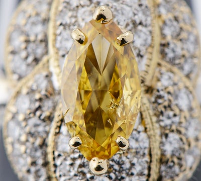 マーキスブリリアントカットのナチュラルオレンジーイエローダイヤモンド0.572ctをセットしたリング。内包物はありますが、透明感を感じるそのクリアな煌めきと深みのあるイエローカラーが魅力的な石です。花びらのように重なったエレガントなダイヤモンドの装飾に気品が漂います。個性的なデザインが存在感を放つ、ボリューム感のあるジュエリーです。※製造元を示すと思われるロゴ刻印有