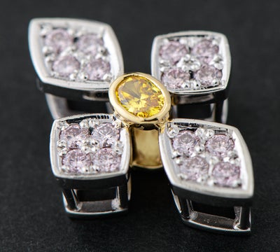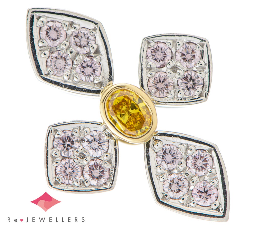 稀少なピンクダイヤモンドとイエローダイヤモンドを贅沢にあしらったペンダントトップ。中央には、濃密な色合いが存在感を放つ0.093ctのオーバルブリリアントカットのイエローダイヤモンドをセット。程よいサイズ感で、日常の装いから華やかなシーンに至るまで幅広くお楽しみいただけます。