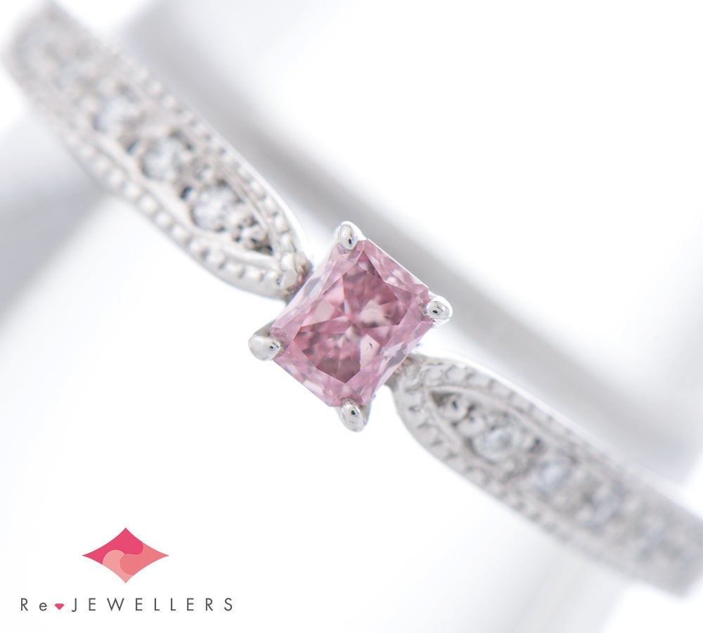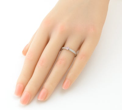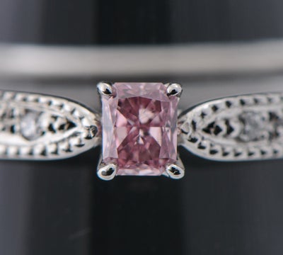 稀少なFANCY INTENSE PURPLISH PINKダイヤモンド、0.13ctをセットしたクラシカルなリングです。ミル打ち風の装飾を施した華奢な印象のアームは、石のサイドを絞りメインストーンの存在感を引き立てています。柔らかなクッションカットと落ち着いた色合いに魅了される、フェミニンなジュエリーです。