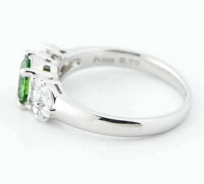 深い黄緑色に鮮やかな色合いが目を引く、デマントイドガーネット0.79ctのリング。ロシアやヨーロッパでは幸運の象徴とされたインクルージョン、ホーステールをルーペで確認することができます。存在感を放つ個性的なクッションシェイプにマーキスブリリアントダイヤモンドをあしらい、エレガントに仕上げています。あらゆるシーンで楽しむことのできる、華やかで魅力的なジュエリーです。
