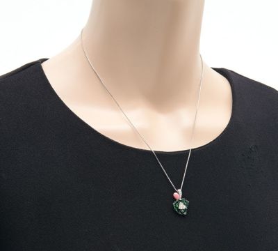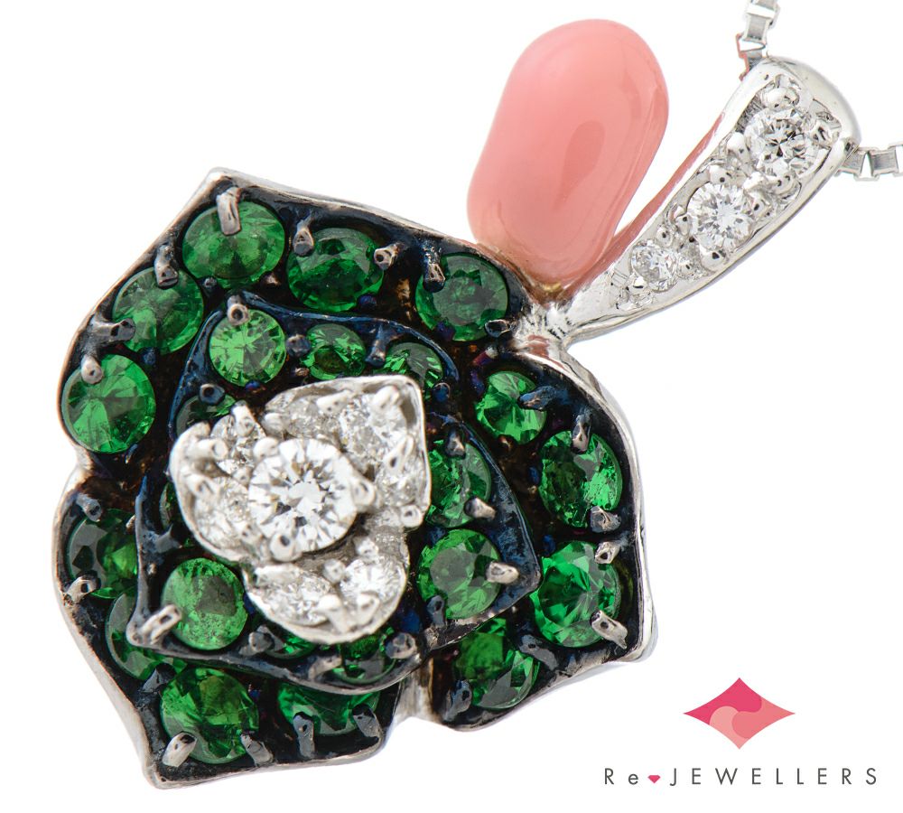 グリーンガーネットの深い緑色を、ブラックコーティングが引き立てる個性的な薔薇モチーフのペンダント・ネックレス。稀少なコンクパールの柔らかなフォルムと色合いが、優雅で気品ある華やかさを演出します。シンプルながらユニークな組み合わせが存在感を放つ、オリジナリティ溢れるジュエリーです。