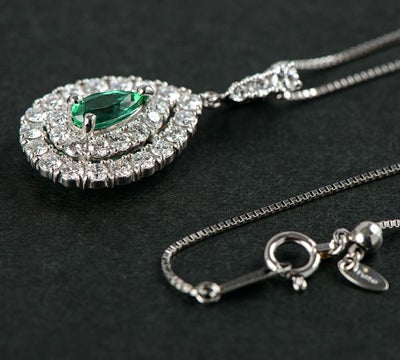 僅かにブルーを帯びたグリーンカラーが特徴的な、稀少なブラジル産パライバトルマリン0.57ctをセットしたペンダント・ネックレスです。透明感のある煌めきと、ペアシェイプカットの持つ凛とした佇まいを引き立てるダイヤモンドの装飾が、エレガント。二重の取り巻きの間に少し空間を持たせることで、形がより強調されその美しさが引き立ちます。人気の高いパライバトルマリンを楽しむことのできる、気品溢れるジュエリーです。