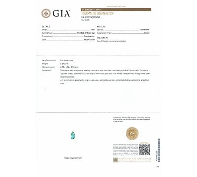 宝石名:パライバトルマリン 重さ:0.57ct サイズ:6.98×3.74×2.96mm 形状:ペアシェイプカット 処理:現在色の起源を特定することはできません。 産地:ブラジル産