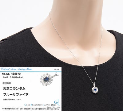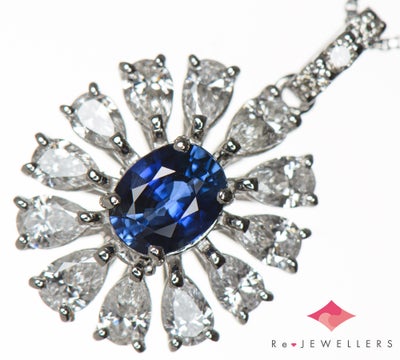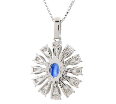 やや紫を帯びた鮮やかなブルーカラーが美しいブルーサファイアのペンダント・ネックレス。周りをペアブリリアントカットダイヤモンドで放射状に取り巻いた美しいデザインが目を引きます。優れたテリが生み出すシャープな煌めきと深い色彩とのコントラストが、存在感を放ちます。コーディネートをワンランクアップしてくれるエレガントなジュエリーです。