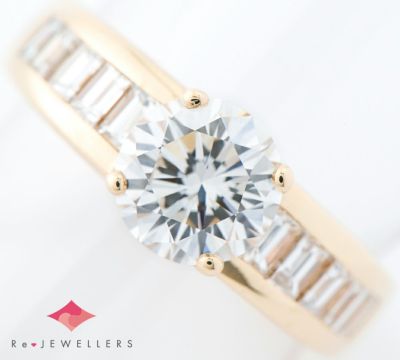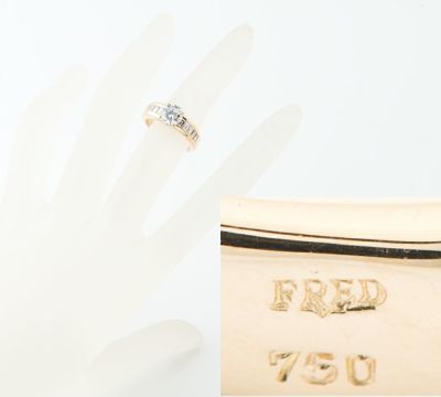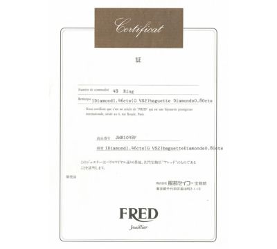 1.46ct、G、VS2のダイヤモンドをセットしたフレッドのリング。1.46ctと十分なサイズですが、実重量以上の圧倒的な存在感を感じさせる、迫力のあるファイアと煌めきが魅力的です。コントラストが美しいステップカットダイヤモンドとイエローゴールドは、メインストーンに合わせ程よい重厚感のあるデザイン。上質な素材こそ、シンプルに。末永くご愛用いただける、洗練された上質なダイヤモンドジュエリーです。※アーム内には合計のカラット数2.26が打刻されています。保証書に1.46cts(G VS2)、と0.80ctsの記載が有ります。