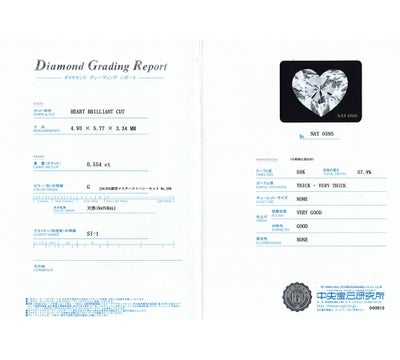 重さ:0.554ct カラー:G クラリティ:SI1 研磨状態:VERYGOOD 対称性:GOOD サイズ:4.93×5.77×3.34mm 蛍光性:NONE 形状:ハートブリリアントカット