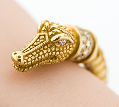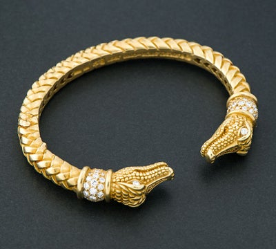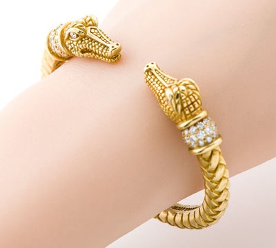 特徴 40年以上にわたりアメリカのデザイナー、アーティスト、写真家であるキーゼルシュタイン コード Kieselstein-Cordが設立した世界中で愛されるBKCブランド。裏面もしっかりと精巧に作られたワニモチーフのトルク ブレスレットです。首元と瞳にあしらわれた煌びやかなダイヤモンドに、ラグジュアリー感が漂います。片方を外側に開くことで、着脱も簡単に。唯一無二と言っても過言ではない、存在感のある格調高いジュエリーです。