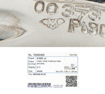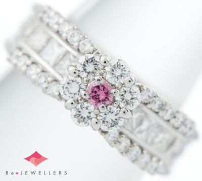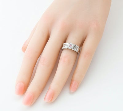 銀座に店舗を構えて50年来、真のジュエリーを提供し続けるミワジュエリー。FANCY VIVID PURPLISH PINK、0.050ctのダイヤモンドをセットした贅沢なリングです。存在感を放つビビッドな色合いに魅了されます。花のようなメレダイヤモンドの取り巻きと、高低差とプリンセスカットダイヤモンドを組み合わせた重厚感のあるデザインが特徴です。ただ可愛らしいだけではなく、稀少なピンクダイヤモンドのエレガントな魅力を存分に堪能できる逸品です。