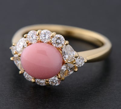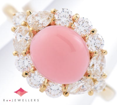 ベルエクラの代名詞とも言える、上質なコンクパールをセットした贅沢なリング。2.13ctとサイズも申し分なく、バランスの取れたオーバルカットを活かしたシンプルなデザインに気品が漂います。眩いダイヤモンドの輝きから伝わる、素材へのこだわり。なかなか出会うことのできない、品質の高い稀少なコンクパールの魅力を存分に堪能できるジュエリーです。