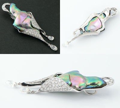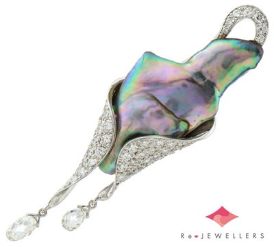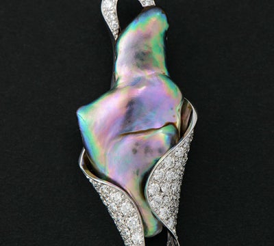 品質の高い新感覚のパールジュエリーをつくり続ける木下パールのペンダントトップ。稀少なアワビ天然真珠の本来の形を活かし、型にとらわれない斬新なデザインに目を奪われます。包み込むような柔らかなフォルムに、メレダイヤモンドを滑らかにパヴェセッティング。先端にはブリオレットダイヤモンドを2石あしらった贅沢な仕上がりに。インパクトのある個性的なジュエリーです。