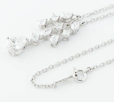 上質なペアブリリアントダイヤモンド1.017ctを主役に、計0.97ctのダイヤモンドを贅沢にあしらったラグジュアリーなペンダント・ネックレス。V字になったチェーンから、煌めく雫のように並ぶ美しいダイヤモンドの数々に目を奪われます。サイドにもプリンセスカットとペアブリリアントダイヤモンドをセットすることで、華やかでラグジュアリー感のあるデザインに。真珠だけでなく、日本におけるダイヤモンドの歴史を築き上げたことでも有名なミキモトが作りあげる気品に満ちたエレガントなジュエリーです。※トップはマルカンに固定されており、左右に可動はいたしません。