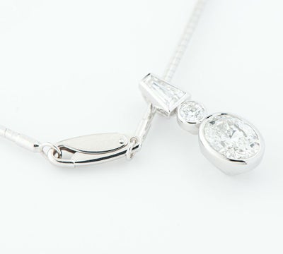 オーバルブリリアントカット、1.06ctの大粒ダイヤモンドをセットしたミキモトのペンダント・ネックレス。広い場面から放たれるクリアな煌めきは、実際のサイズ以上の存在感を放っています。上部には、ラウンドブリリアントとテーパードカットダイヤモンドを組み合わせ、留め爪を使わずすっきりとしたモダンなデザインに仕上げています。ネックレスは、肌馴染みのよい滑らかなオメガチェーンをセレクト。上質な素材こそ、シンプルに。ラグジュアリー感漂う、エレガントなジュエリーです。