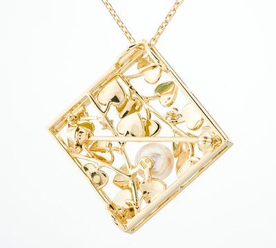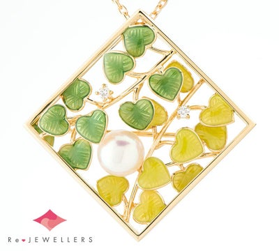 特徴 ため息が出るほど美しい、ミキモトのボタニカルモチーフ ペンダント・ネックレス。艶やかなエナメルで仕上げた瑞々しい新緑と、若葉のような明るい黄緑の葉が生き生きと茂っています。非常に見どころの多い作品ですが、奥行きを意識した葉の配置の素晴らしさには目を見張るものがあります。所々に重なっている個所も多く、熟考された見事なデザイン。アコヤ真珠は非常にテリの良いものがセレクトされており、濃いピンクの干渉色がエナメルの色合いを引き立てています。ペンダントトップは、ブローチとしても使用可能。小さなダイヤモンドが朝露のように煌めく、自然の美しさを感じるジュエリーです。