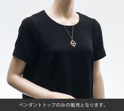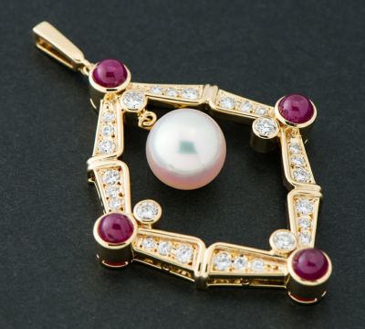 テリの良さと美しい干渉色に魅了されるアコヤ真珠をセットしたミキモトのペンダントトップ。ゆらゆらと優雅に揺れる姿が、エレガントな印象を与えます。周りの枠は、ダイヤモンドとカボションルビーを使用した個性的なデザイン。程よいボリューム感のあるシックなジュエリーです。