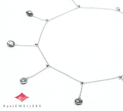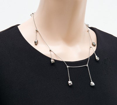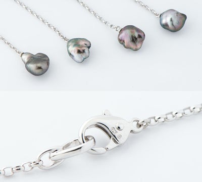 特徴 様々な形をしたバロックシェイプの黒蝶真珠をセットしたステーションネックレス。各パールの上部にセットされている丸いパーツは可動式となっており、それぞれチェーンの長さを変えることで、無限大にイメージチェンジできる遊び心あるデザイン。動きのある個性的なジュエリーです。