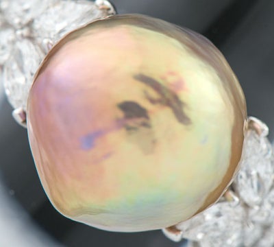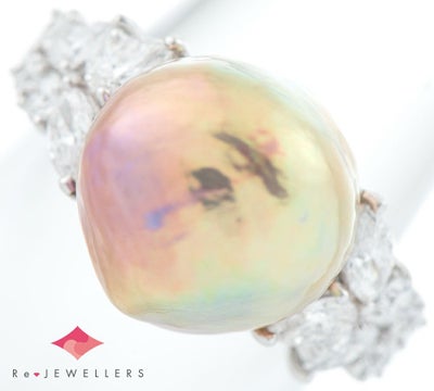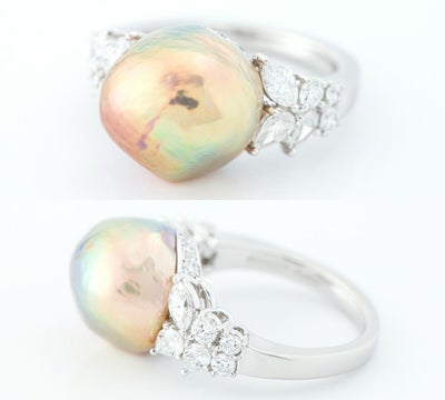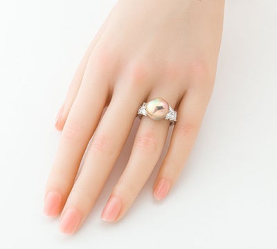 GIA鑑別書で「Non-bead cultured pearl(無核養殖真珠)」、「No indications of treatment(無処理)」と判定された淡水真珠をセットしたミキモトのリングです。縦横12.6mmを超える極めて希少な珠で、オーロラのような美しい干渉色と、柔らかなテリ(光沢)が特徴的です。装飾のダイヤモンドは贅沢に計1.03ctを使用しており、クオリティの高い厳選されたもののみをセレクトしています。洗練されたデザインが個性的なパールの魅力を引き立てる、存在感のあるジュエリーです。