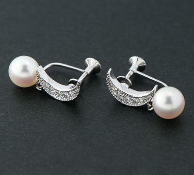 三日月とアコヤ真珠をセットしたミキモトのイヤリングです。三日月の中に左右5石ずつダイヤモンドをセットし、ミル打ち風の装飾が華やかさを演出します。三日月から零れ落ちるようなテリの良いアコヤ真珠がゆらゆらと揺れる様は、おとぎ話を彷彿とさせます。可愛らしくもドリーミングな印象を与えるデザインのジュエリーです。